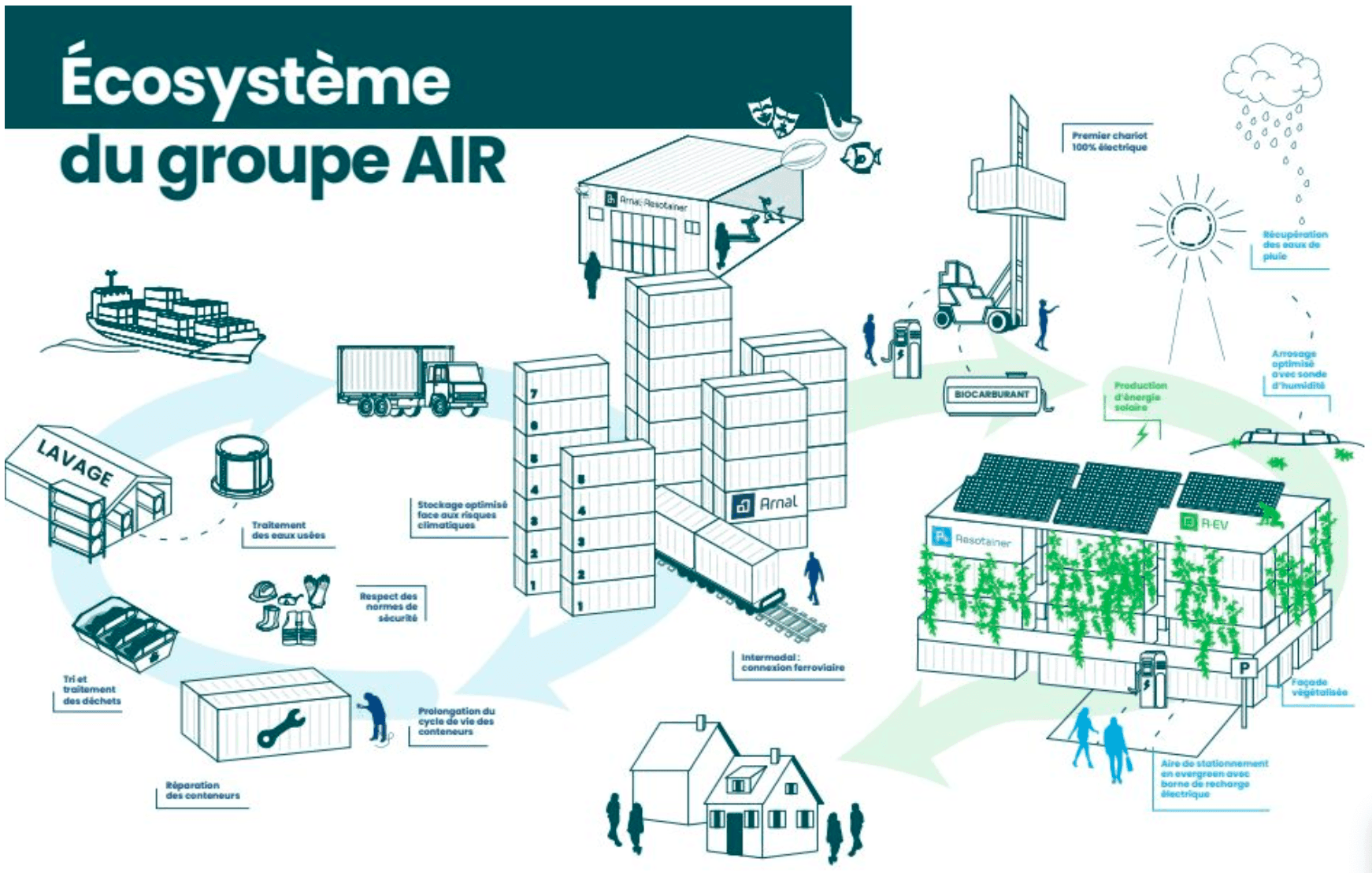 Arnal-Resotainer saisit cette opportunité pour repenser l’héritage qui sera légué aux prochaines générations, en intégrant en 2023 R-Energie Verte à son écosystème de services vertueux et durables. C’est le début de l’aventure de production d’énergie solaire, à commencer par l’équipement en panneaux photovoltaïques des toitures Resotainer. Le groupe se restructure alors sous le nom AIR continuant de nourrir de grandes ambitions pour son futur.